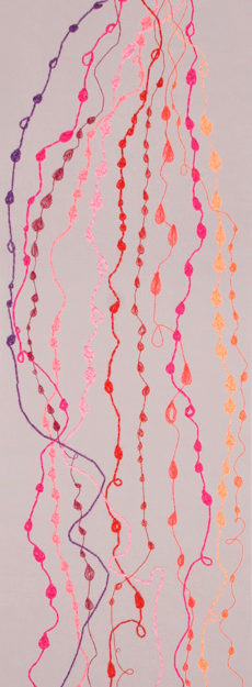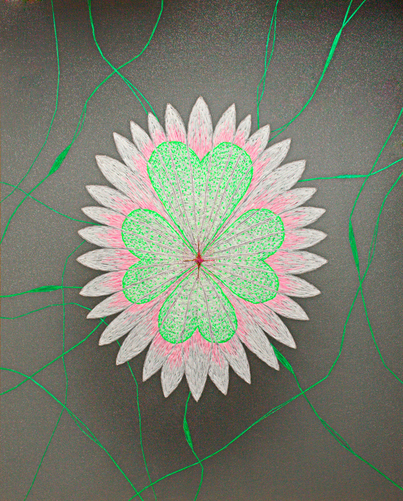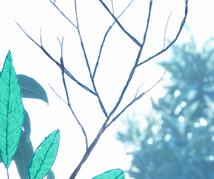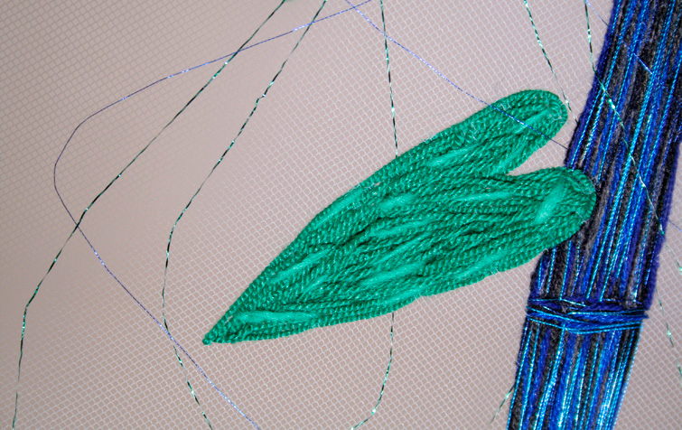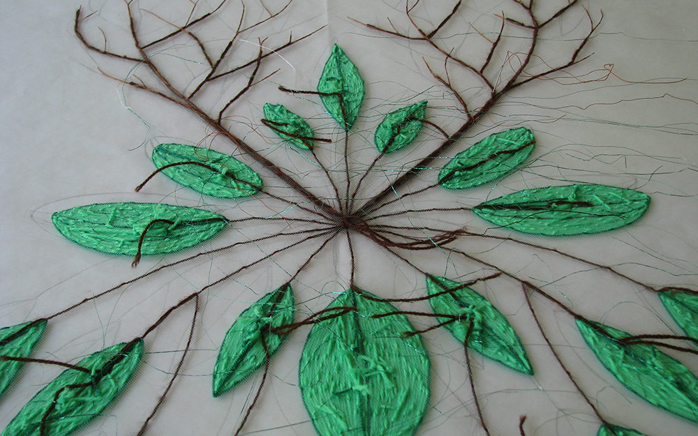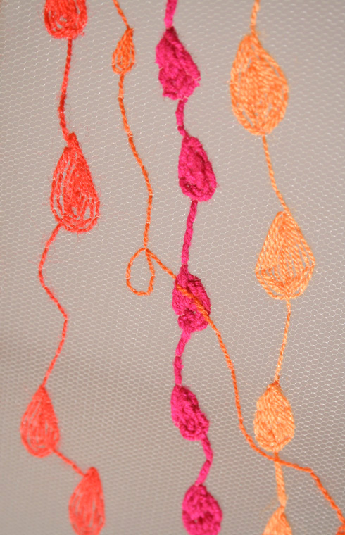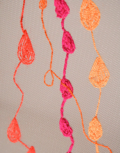 Bordado manual con hilos y lanas sintéticas sobre tela de tul.