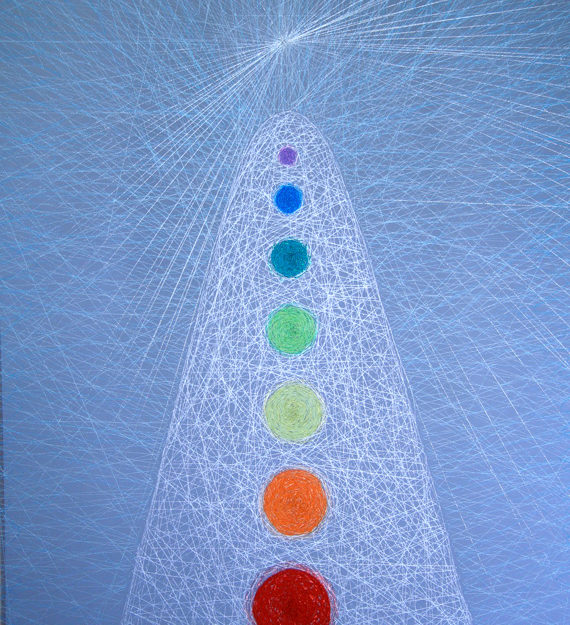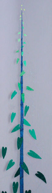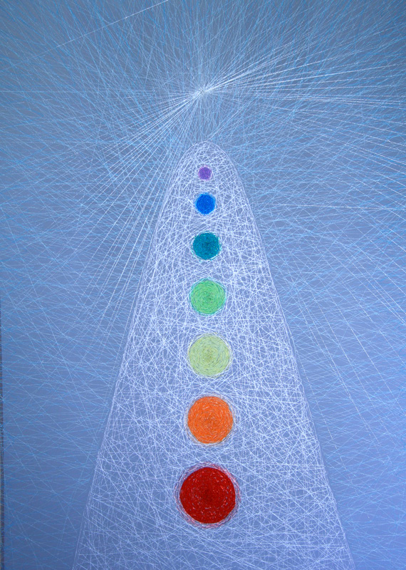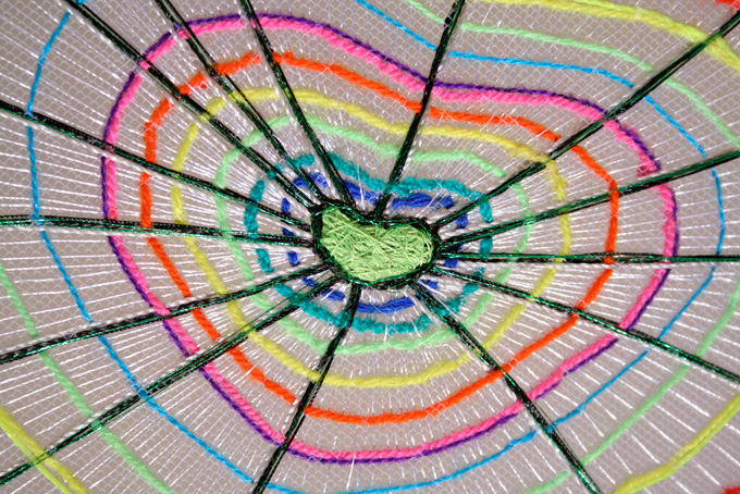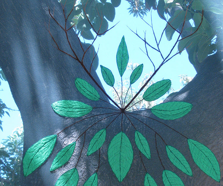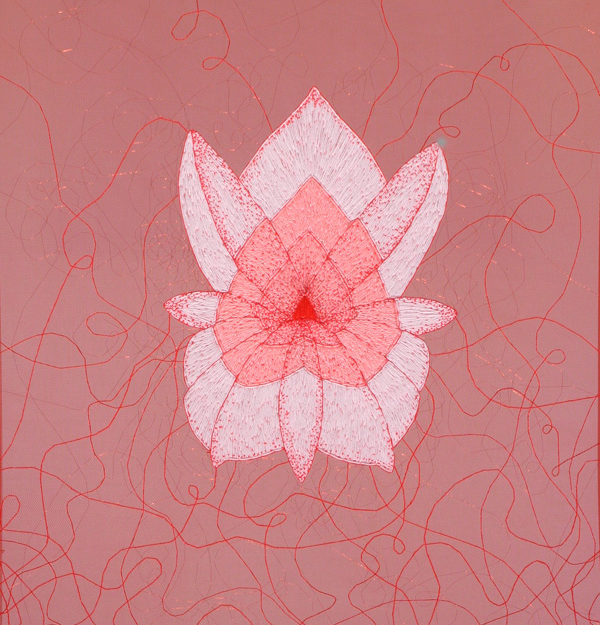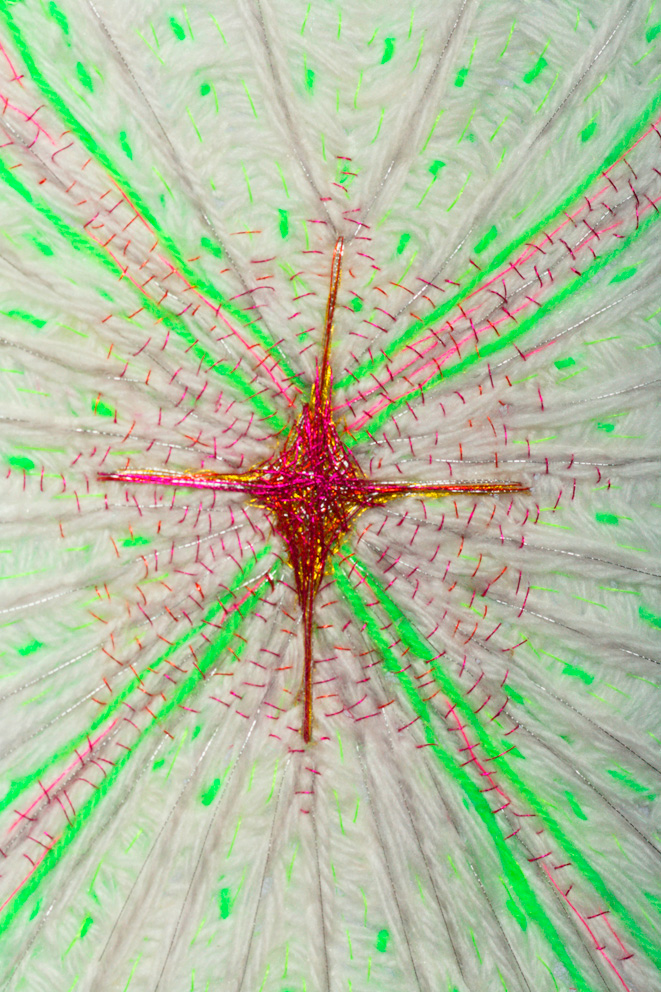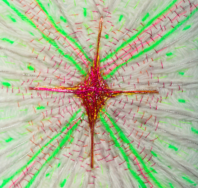 Bordado manual con hilos y lanas sintéticas sobre tela de tul.
