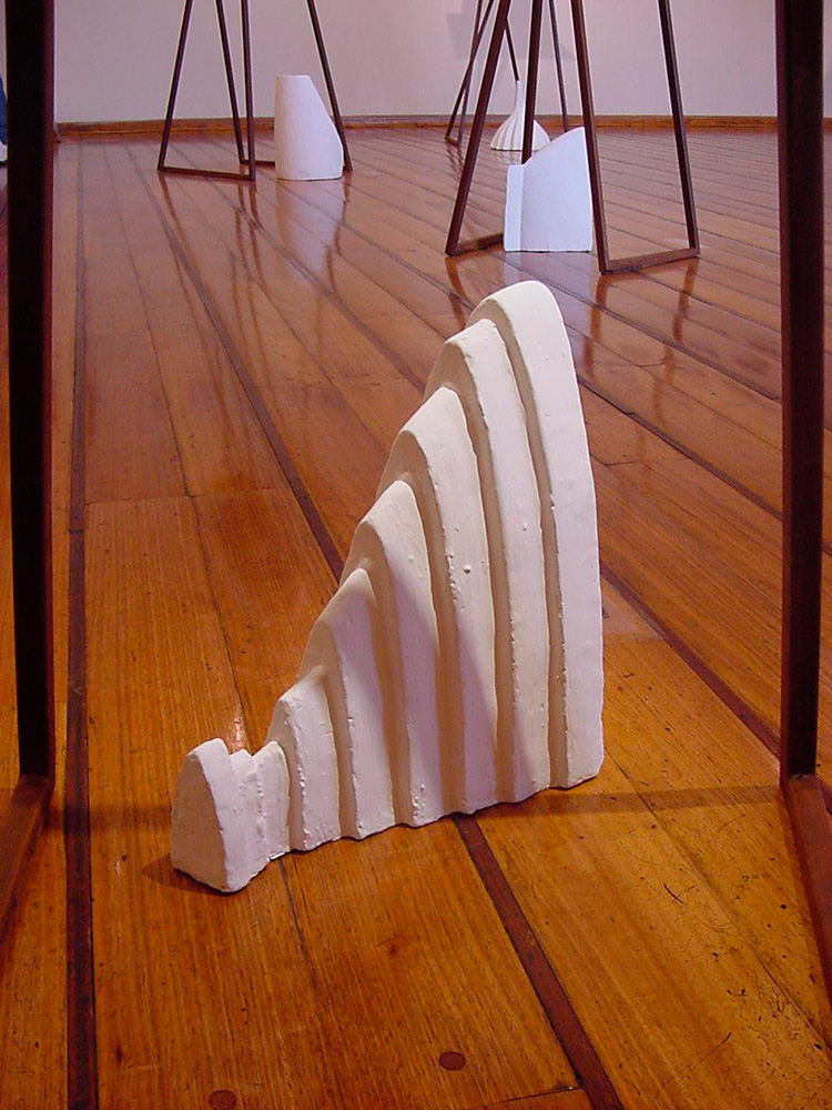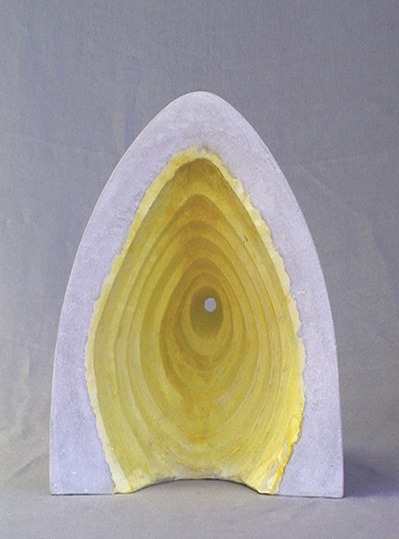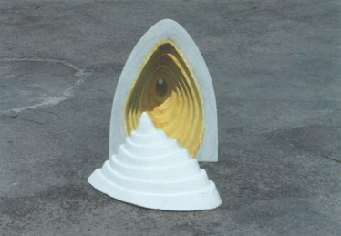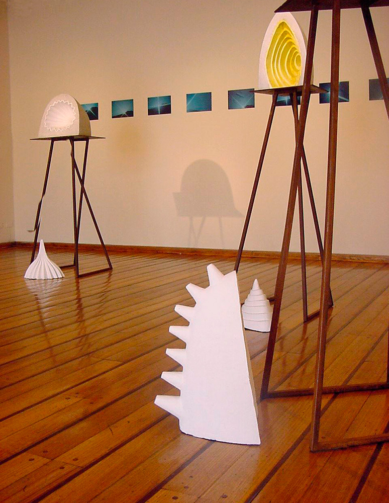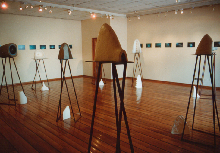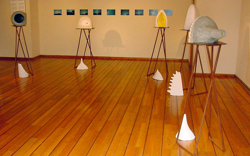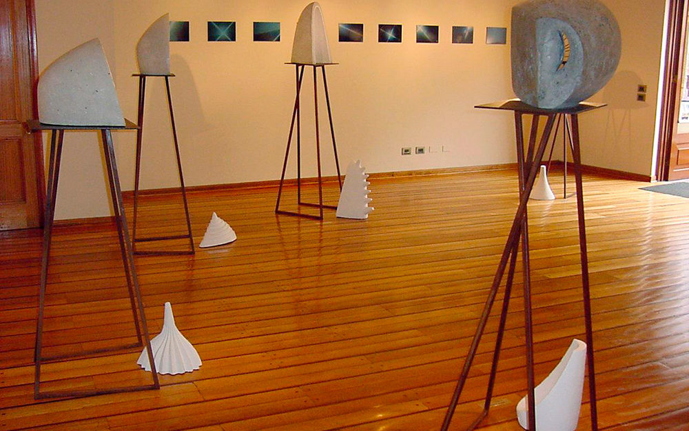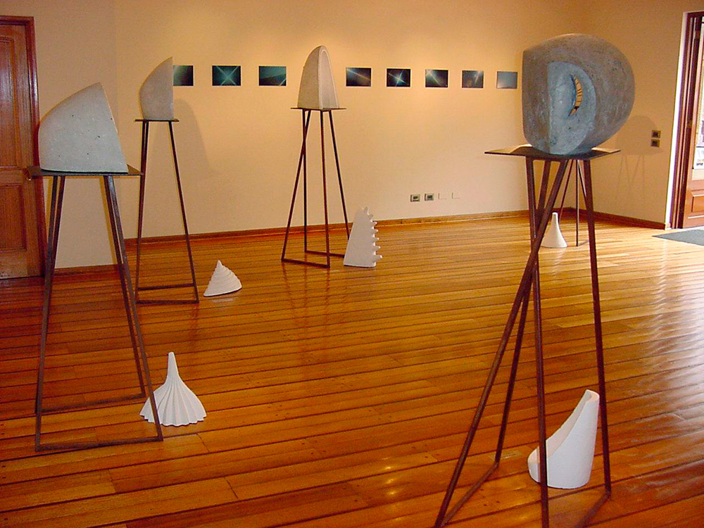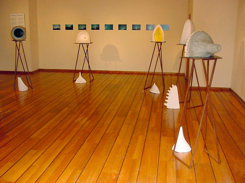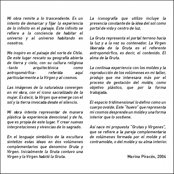 En “Grutas y Vírgenes” mi propuesta escultórica está dirigida a profundizar en los orígenes del espacio tridimensional. Este espacio primero lo defino como un cuerpo ovoide. Este “huevo” que representa mi cosmos desprende un molde o límite, y una forma interior. Es así como las grutas remiten  a ese cuerpo al ser fragmentos y vestigios de esa cáscara exterior-límite contenedor. Las Vírgenes en cambio, se desprenden desde el interior de ese molde, son su matriz interna.