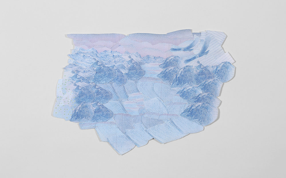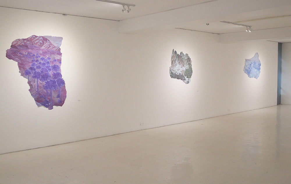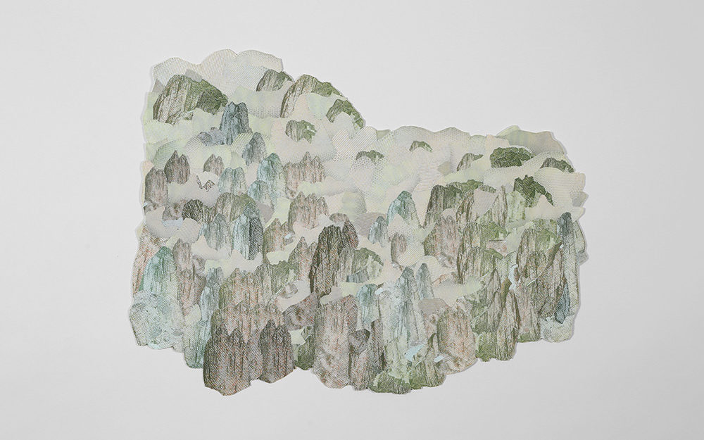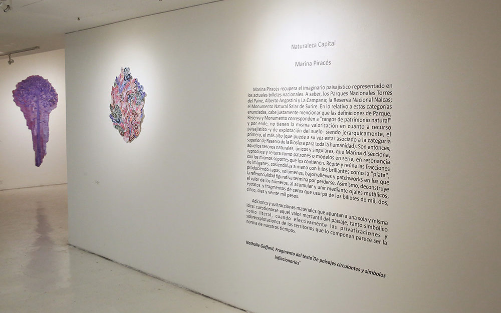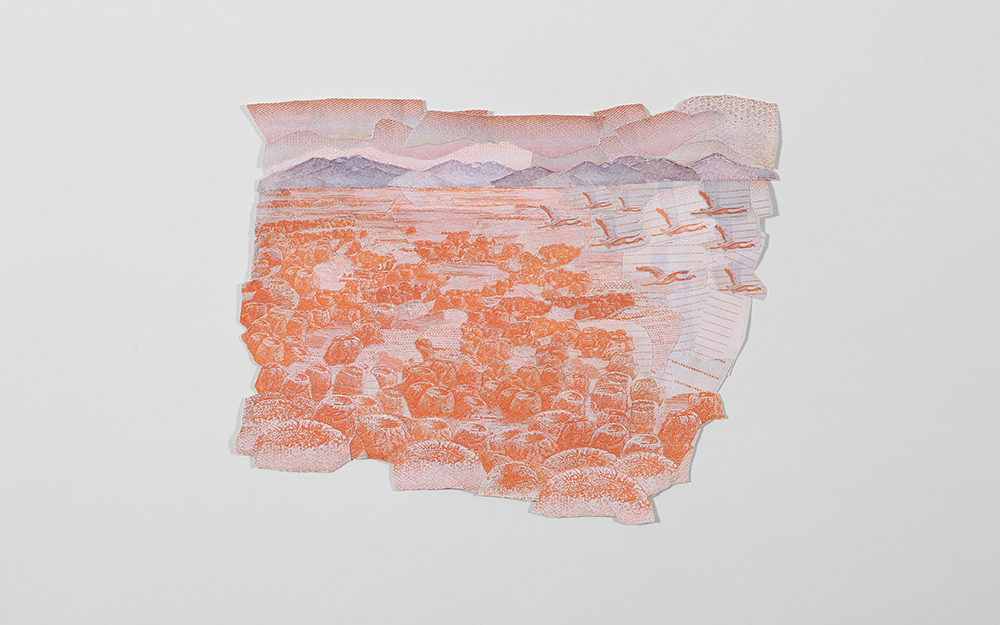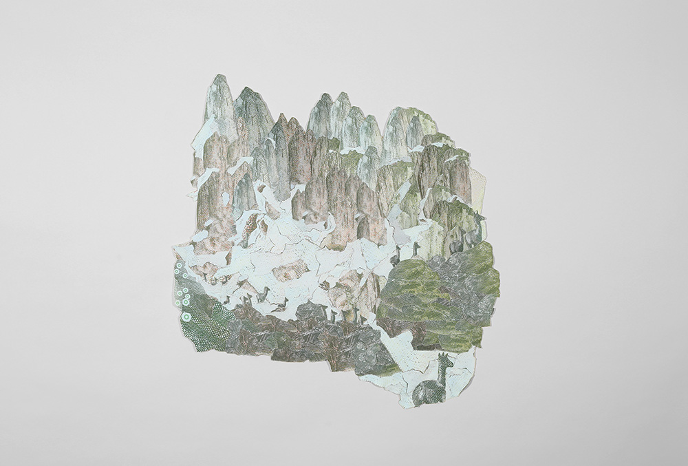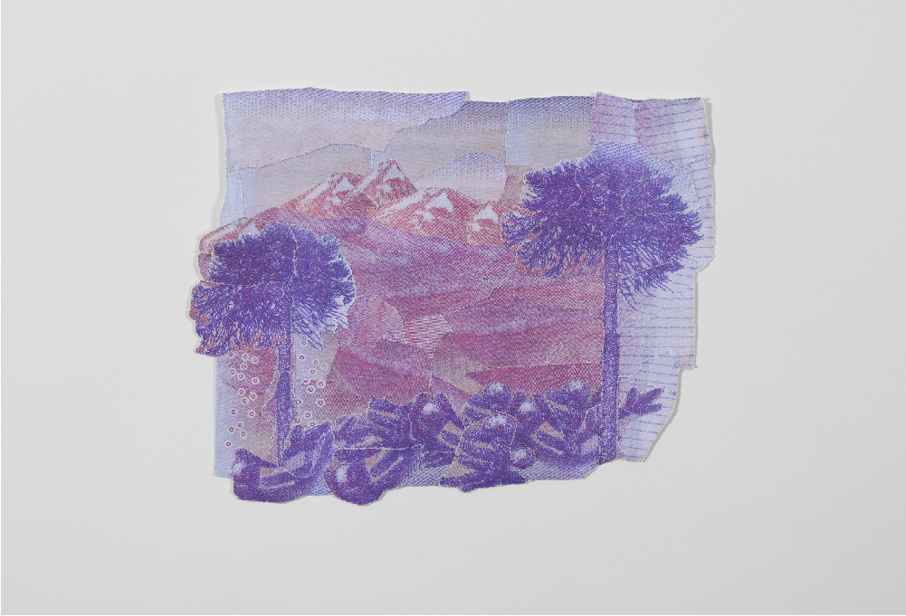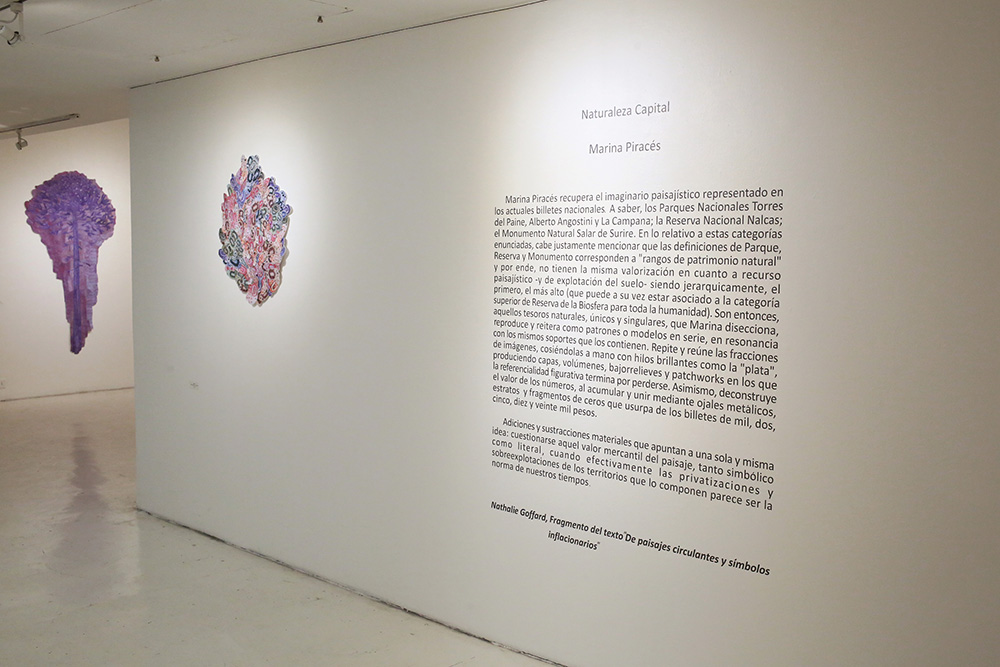 La serie de obras bidimensionales que componen esta muestra abordan la construcción de paisajes imaginarios tomando como punto de referencia la visualidad de los billetes nacionales que actualmente están en circulación: tanto el paisaje en sus reversos como la gráfica de sus dígitos. A partir de este referente visual se articula la problemática de este trabajo en torno a la relación entre paisaje-dinero e identidad.