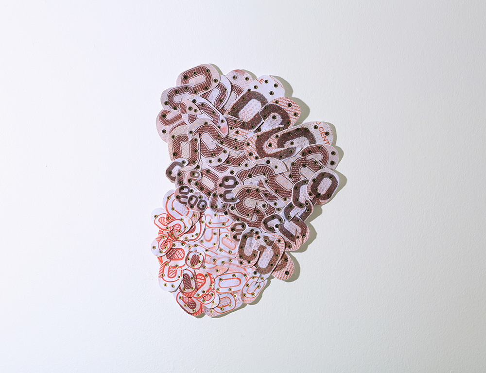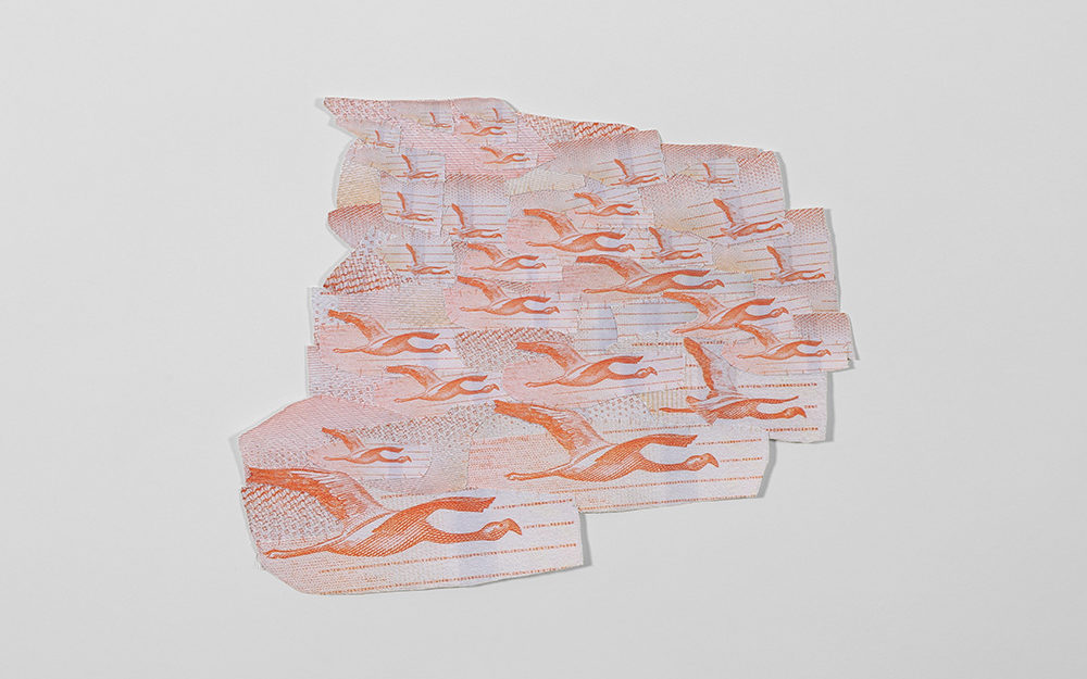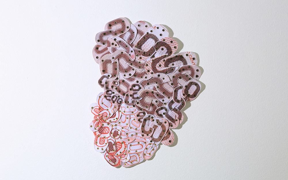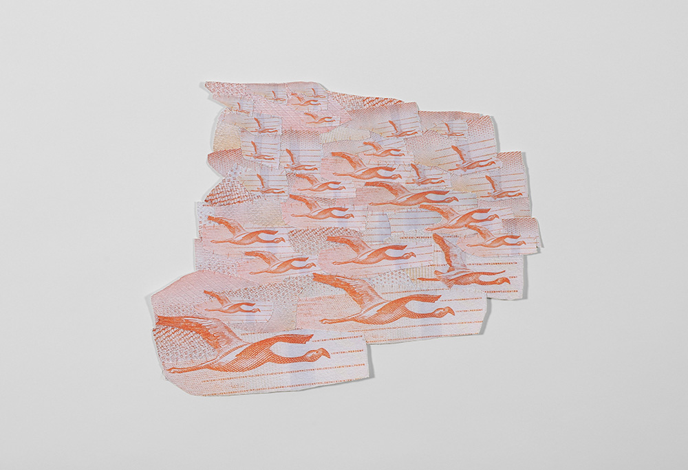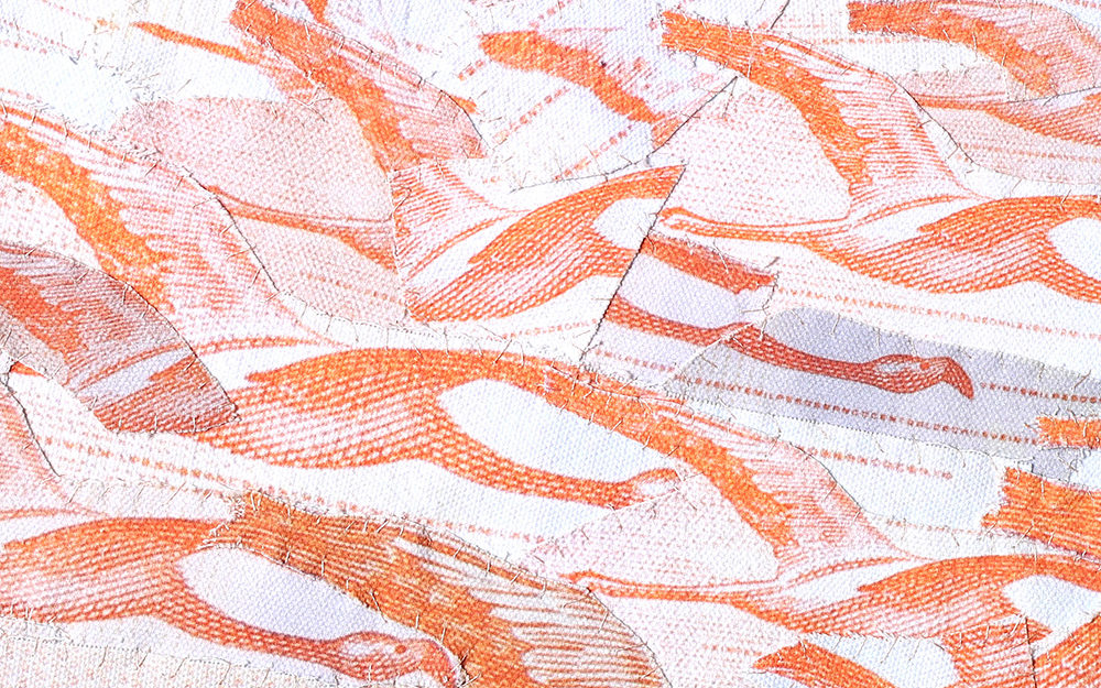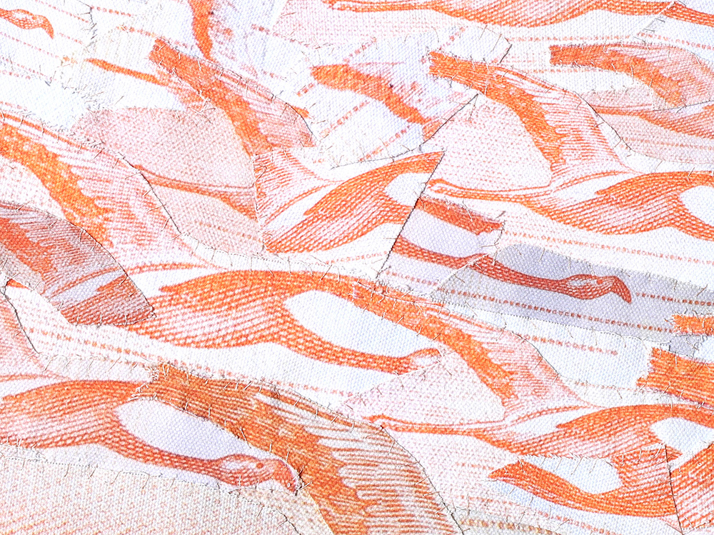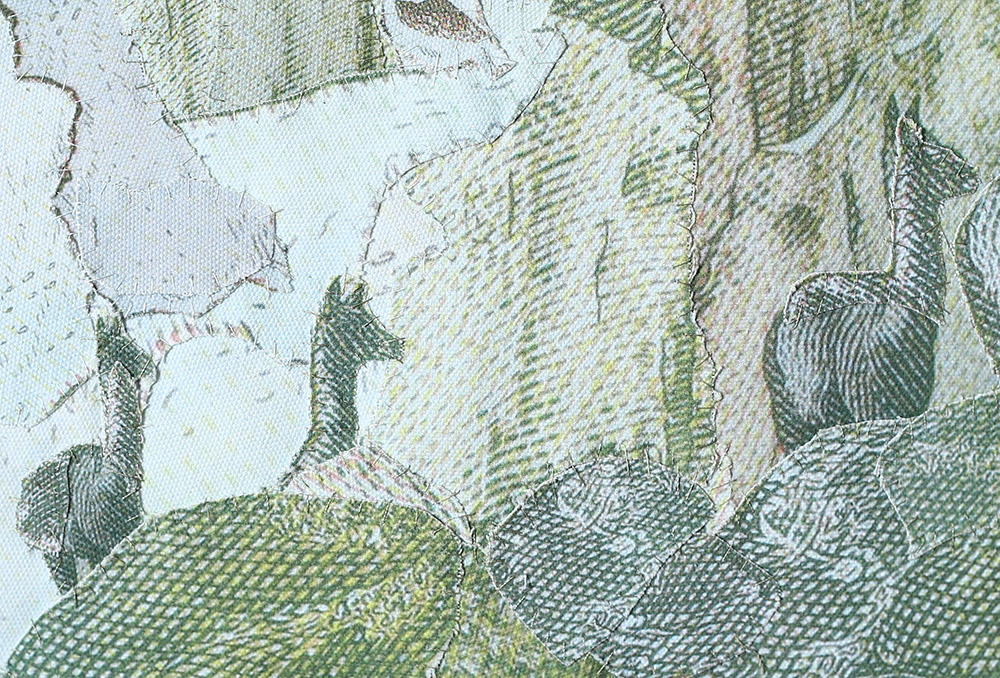 Fotografías -de detalle de billetes- impresas digitalmente sobre tela, recortadas y unidas mediante costura manual con hilos.