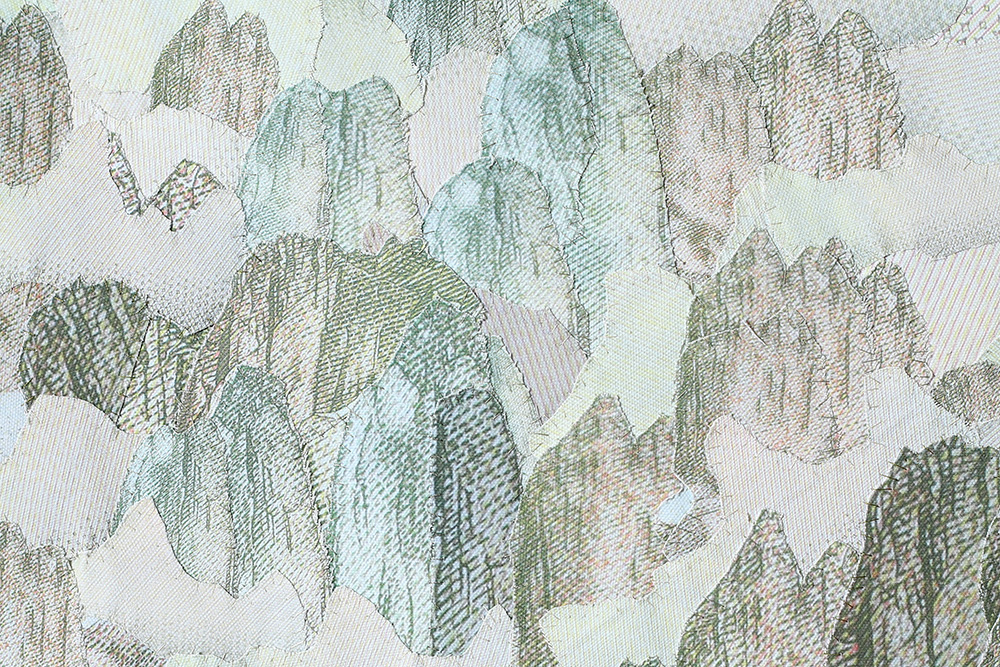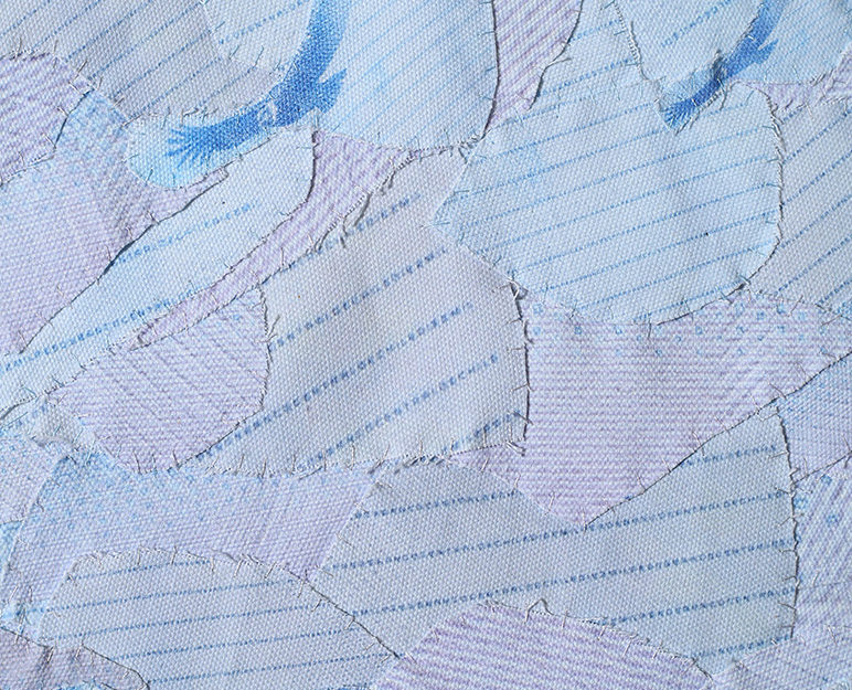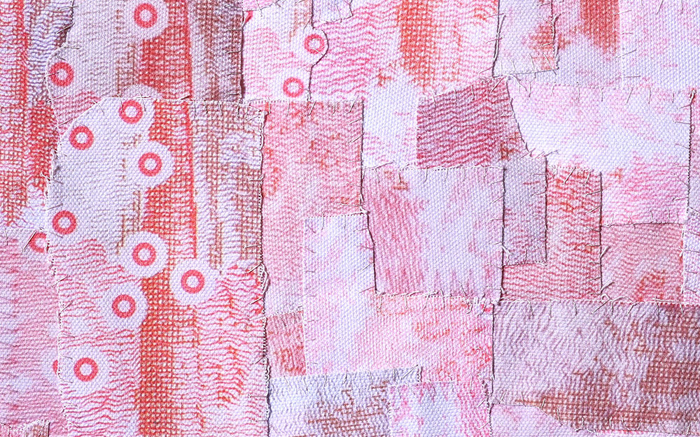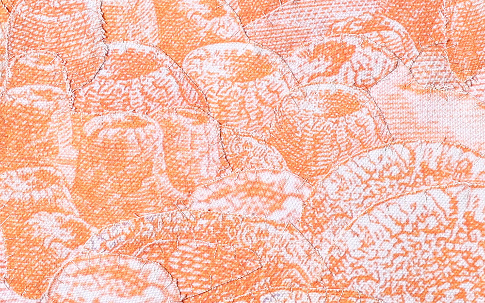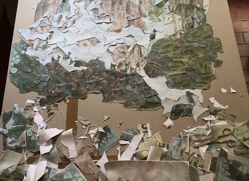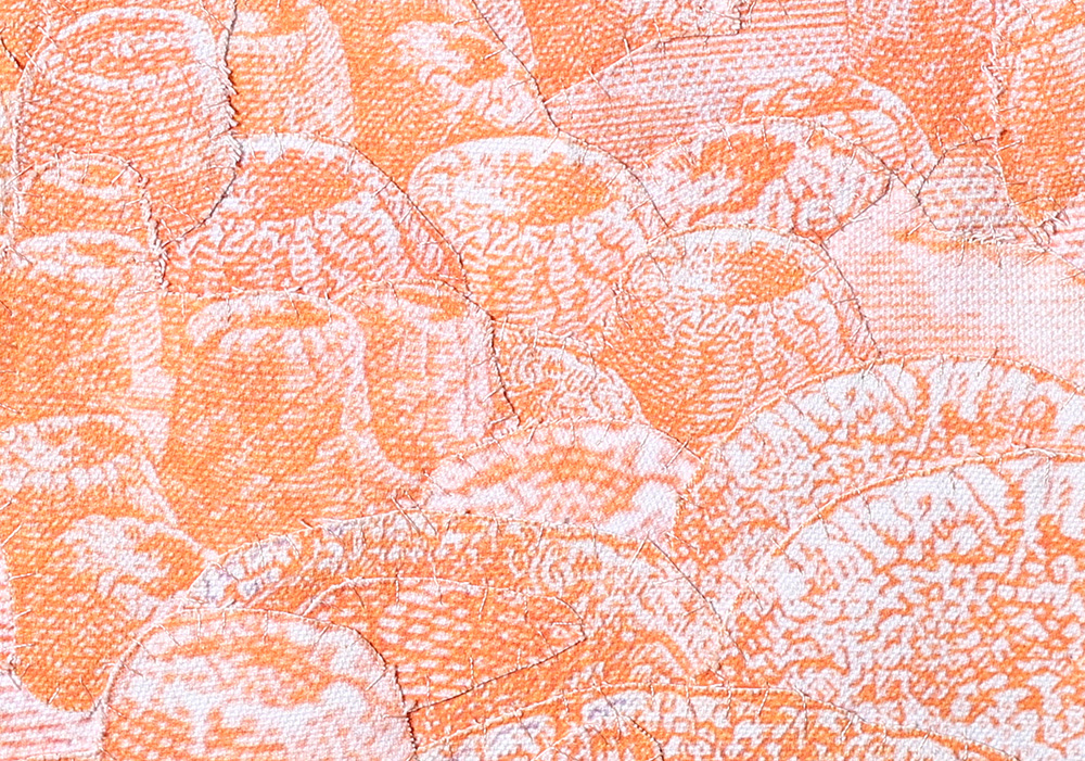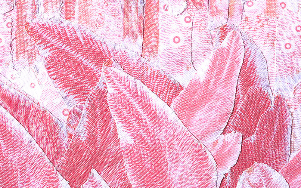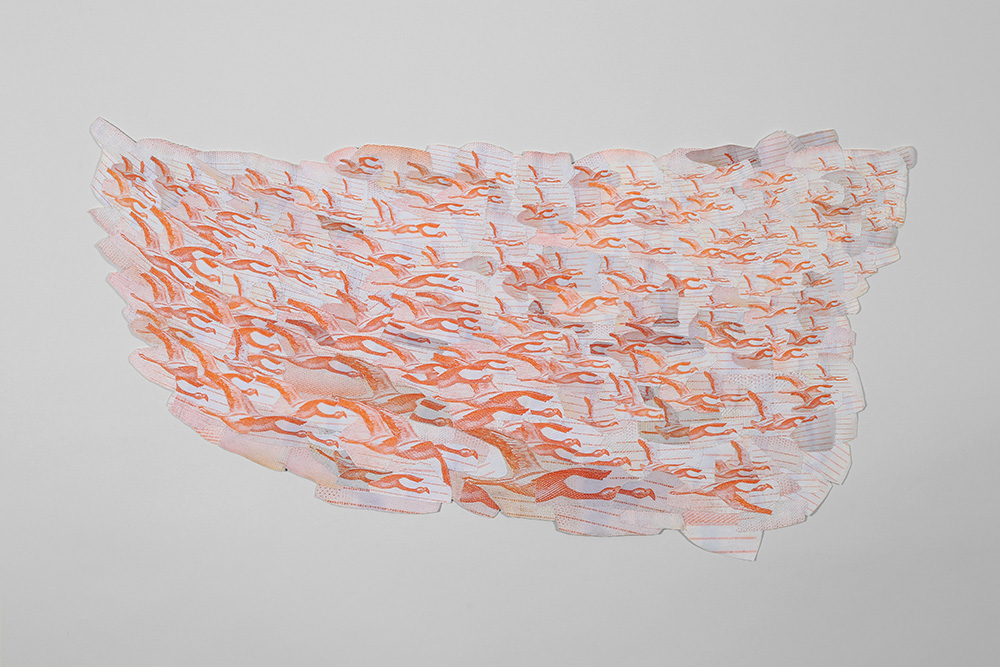 Fotografías -de detalle de billetes- impresas digitalmente sobre tela, recortadas y unidas mediante costura manual con hilos.