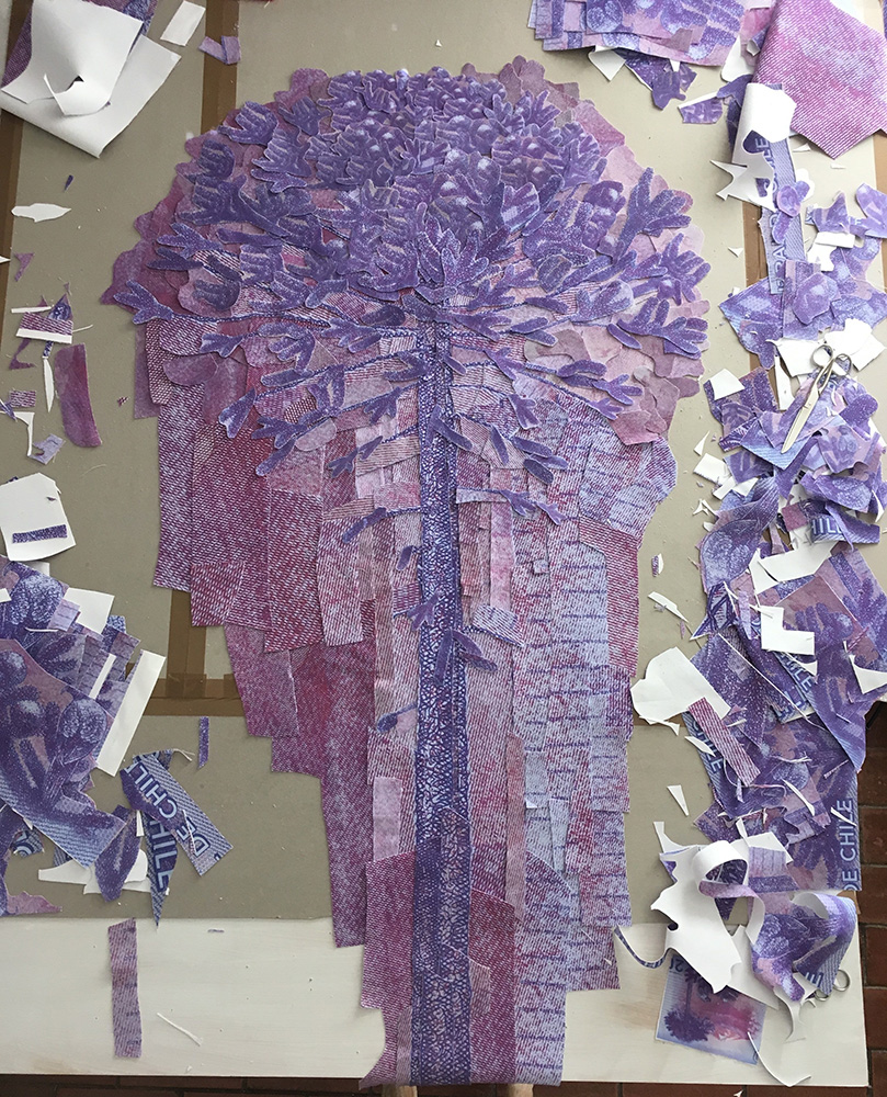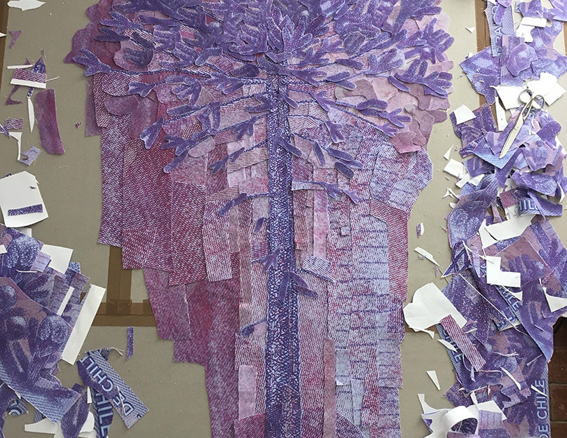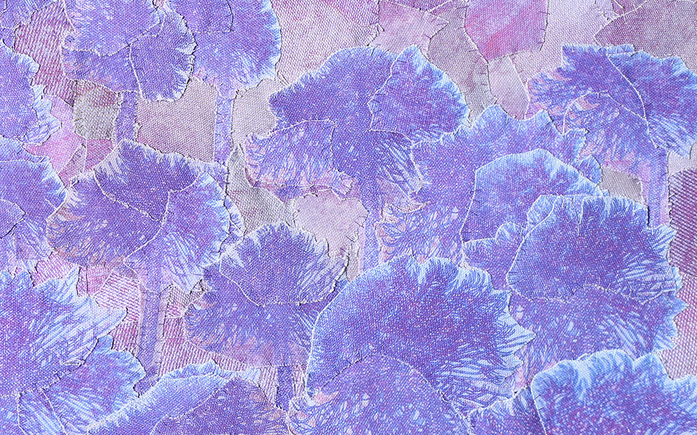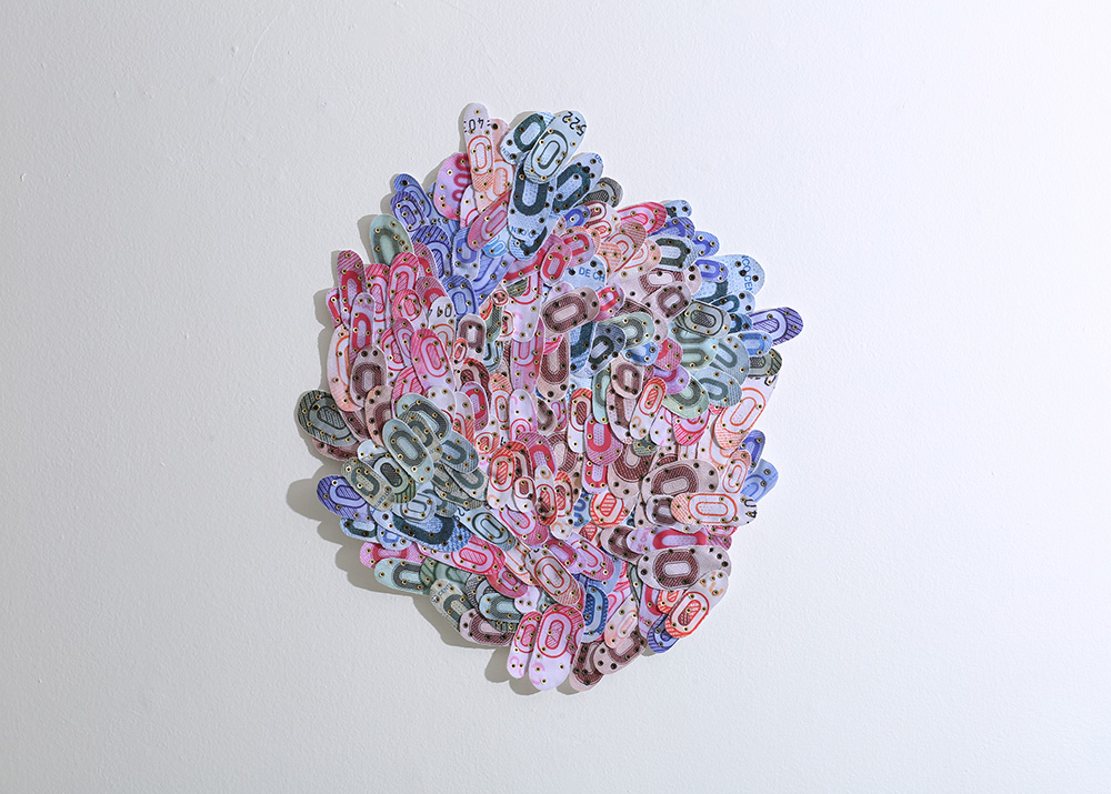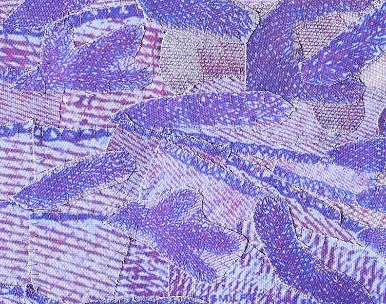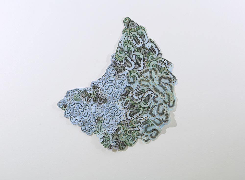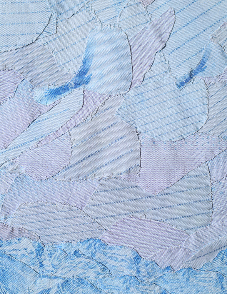 Fotografías -de detalle de billetes- impresas digitalmente sobre tela, recortadas y unidas mediante costura manual con hilos.
