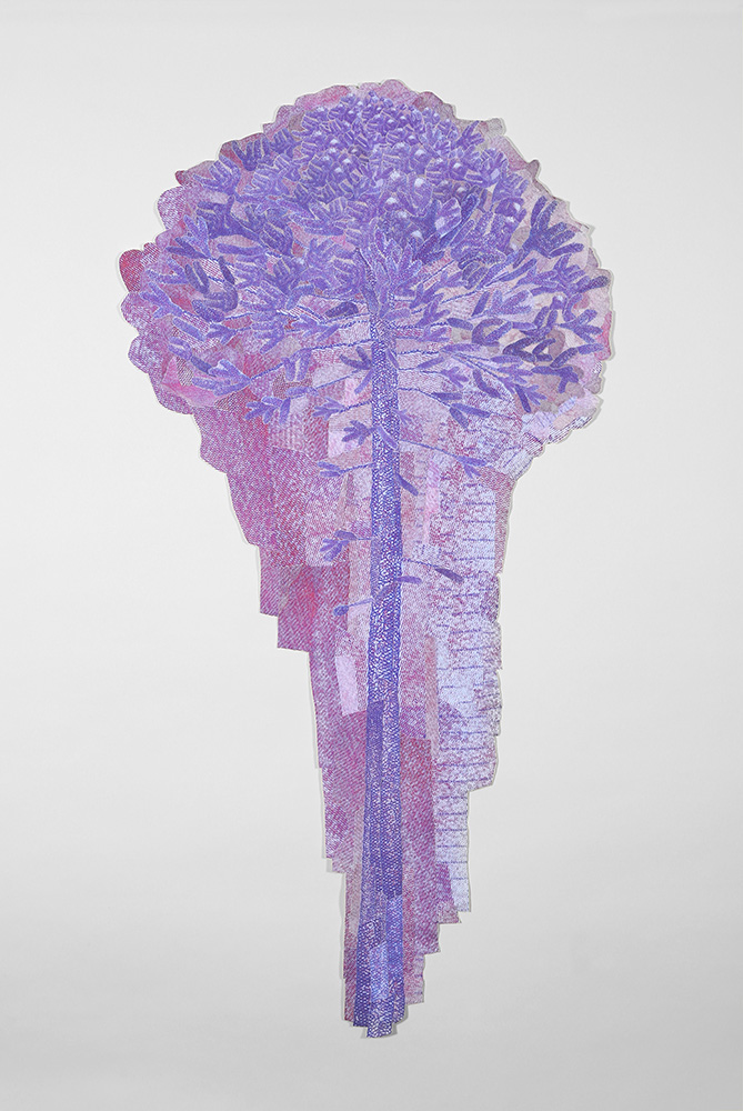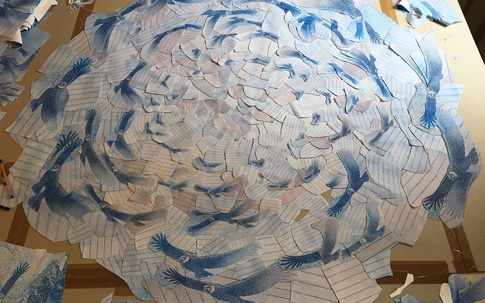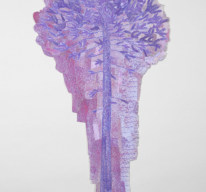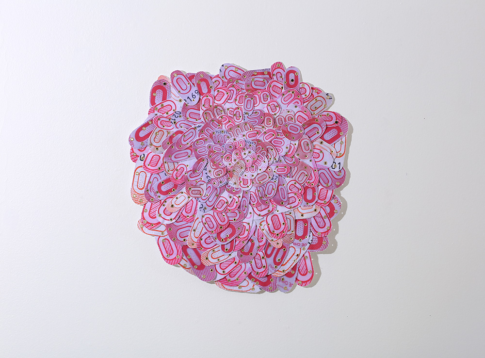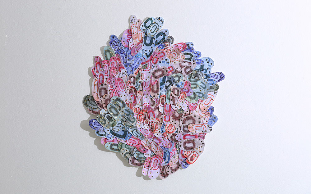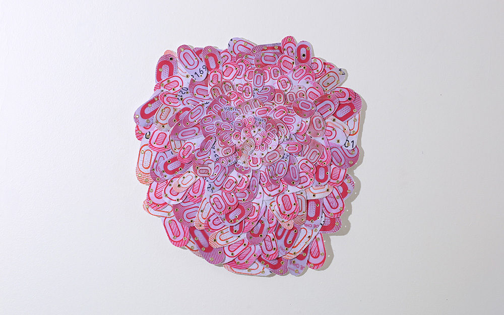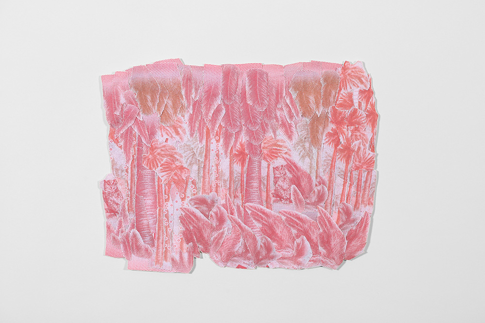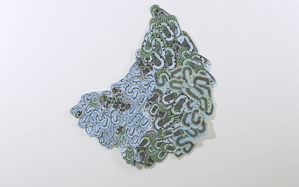 Fotografías -de detalle de billetes- impresas digitalmente sobre tela, recortadas y unidas mediante costura manual con hilos.